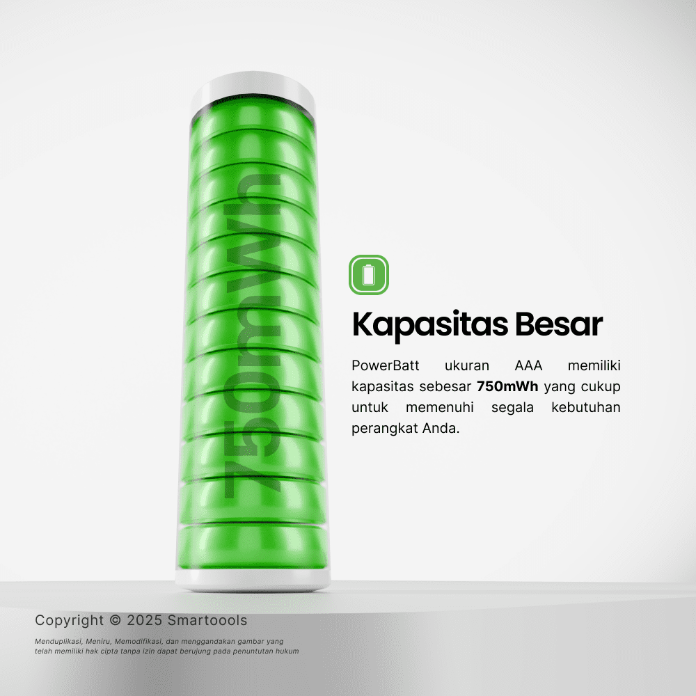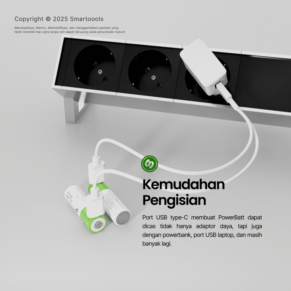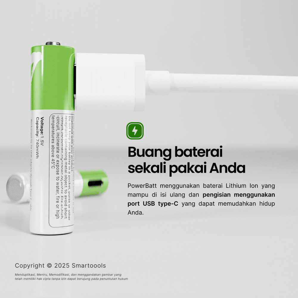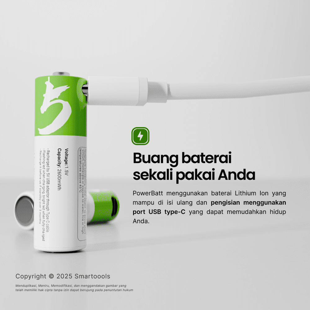 PowerBatt by Smartoools adalah solusi baterai isi ulang dengan daya tahan hingga 1200 kali pemakaian! Dibandingkan baterai sekali pakai yang hanya bertahan 1 kali, PowerBatt bisa digunakan 1200 kali lebih lama, membuatnya jauh lebih hemat, efisien dan ramah lingkungan!
