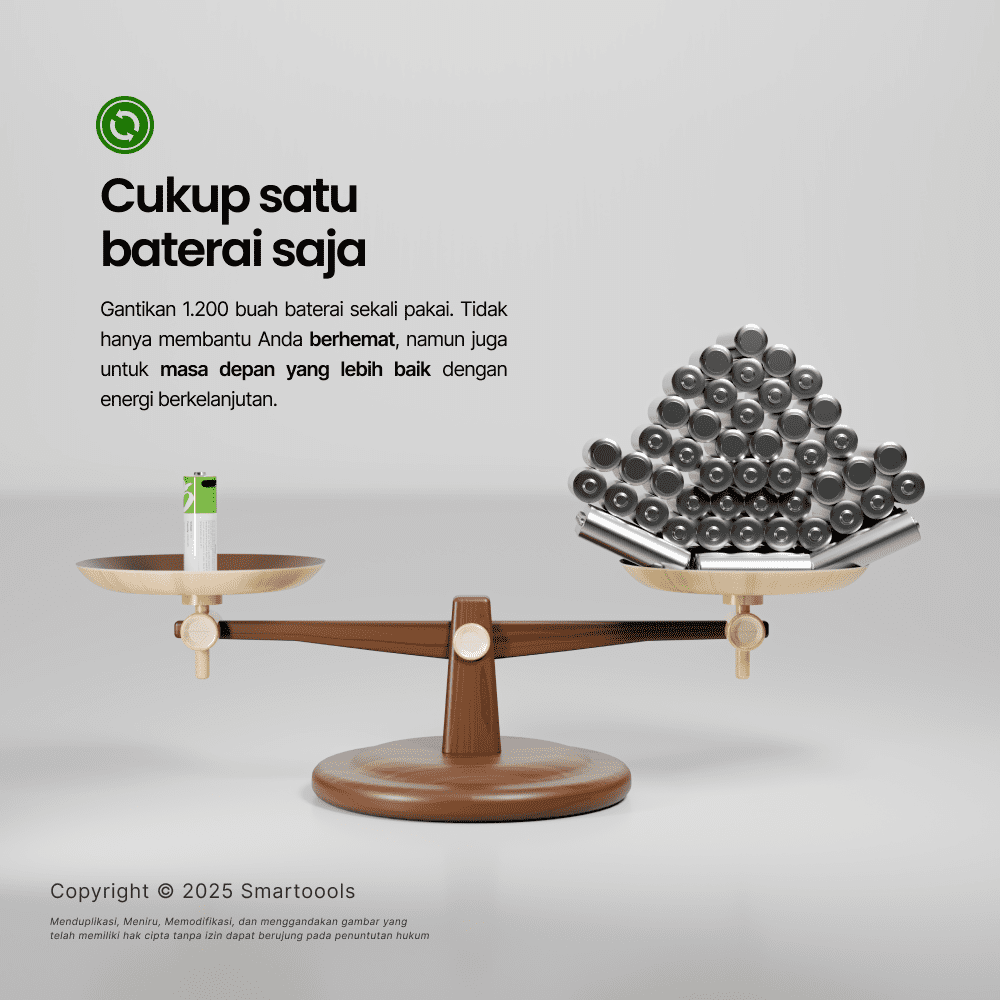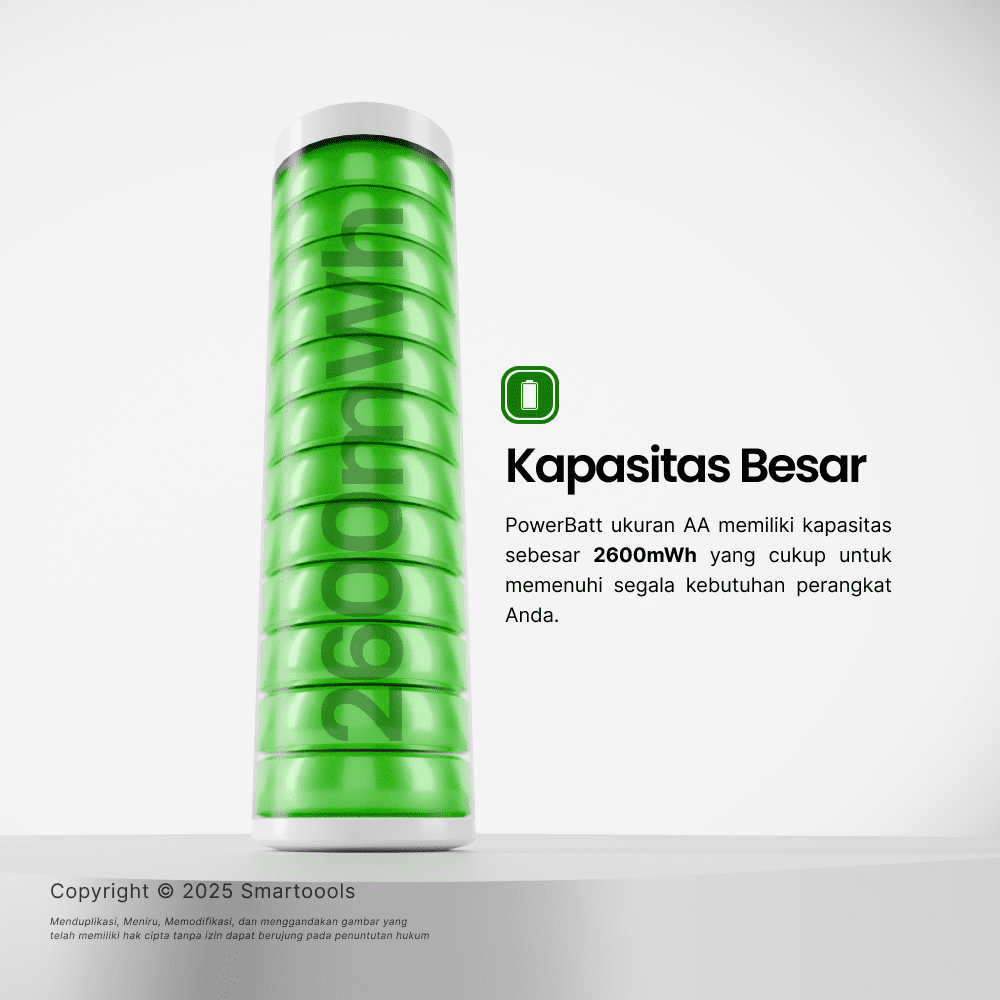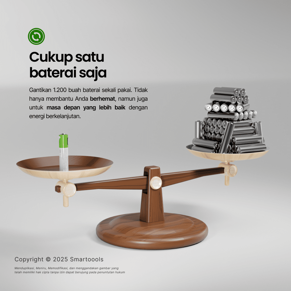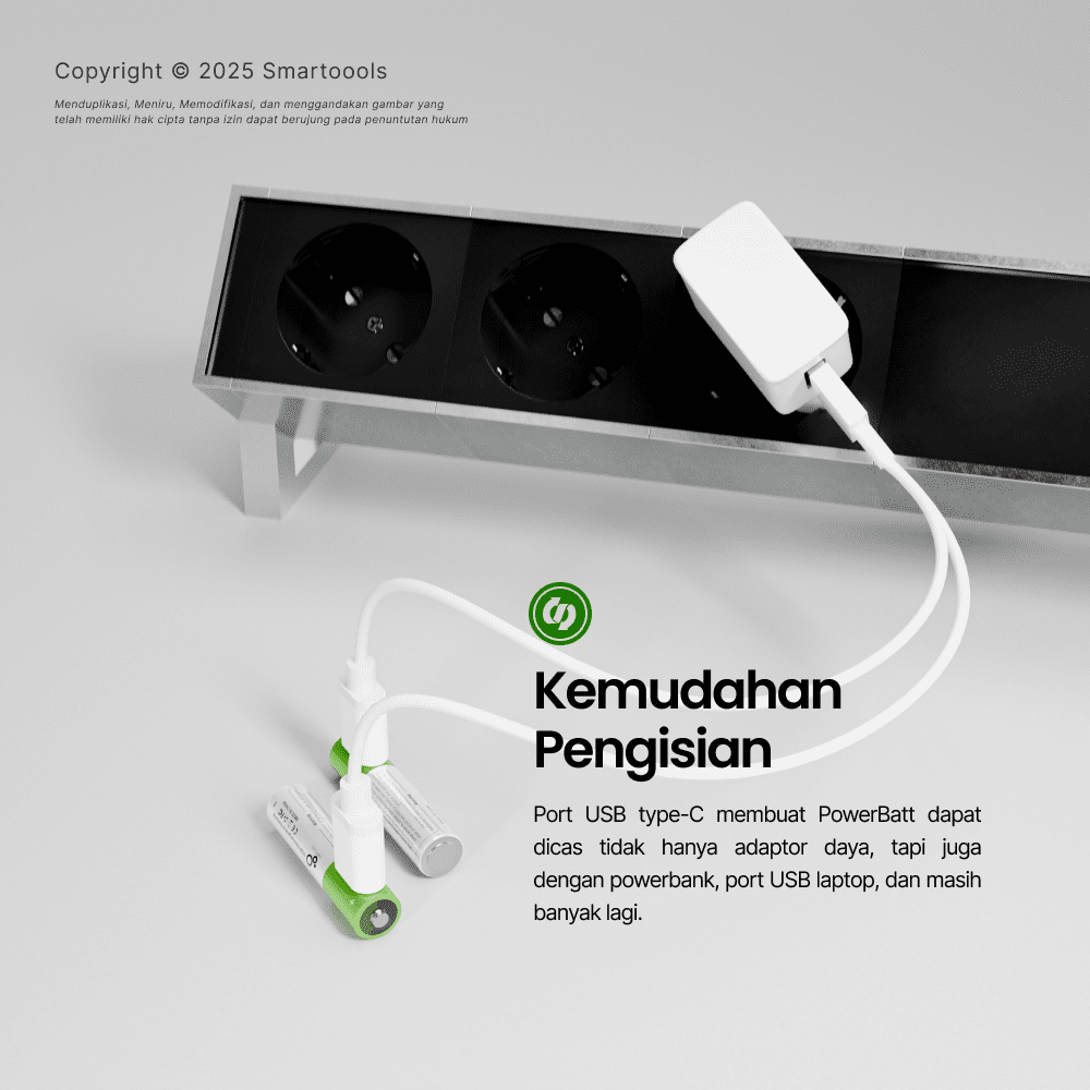 PowerBatt by Smartoools adalah solusi baterai isi ulang dengan daya tahan hingga 1200 kali pemakaian! Dibandingkan baterai sekali pakai yang hanya bertahan 1 kali, PowerBatt bisa digunakan 1200 kali lebih lama, membuatnya jauh lebih hemat, efisien dan ramah lingkungan!